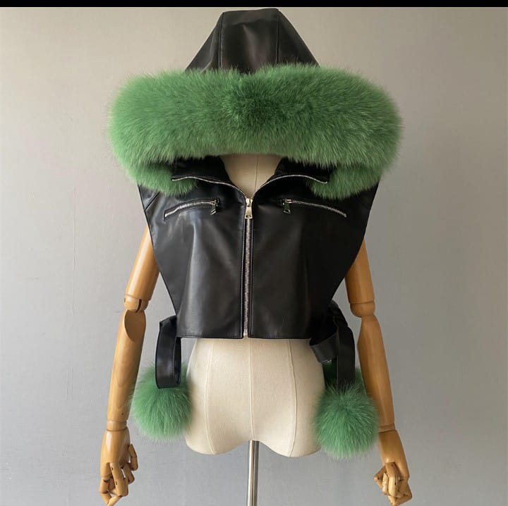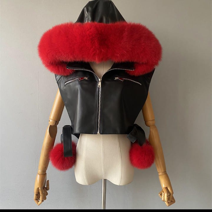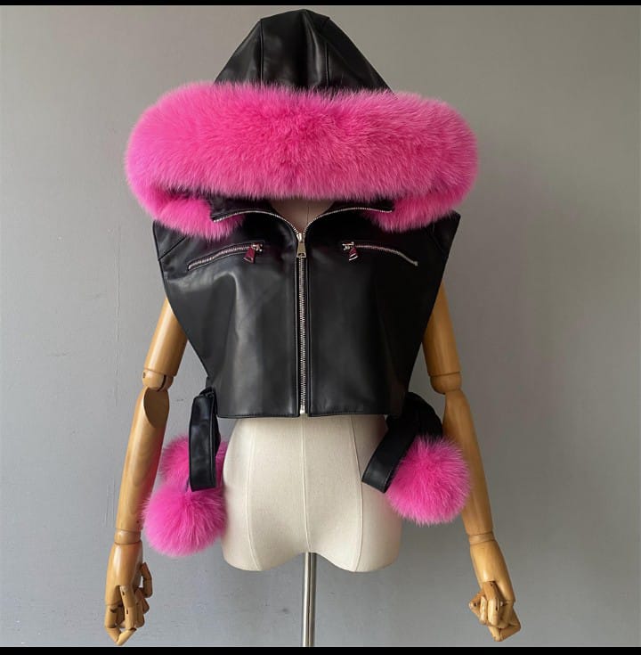 Sleeveless side lace up VEST with hood Sheepskin Leather with 100%fox fur trim
